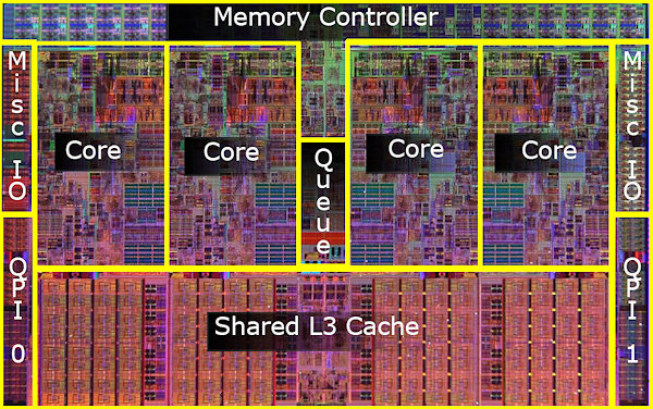 이 집적회로 내에 코어(Core), 입출력(IO) 관리 장치 및 기타 기본 구성요소 또한 포함되어 있다.