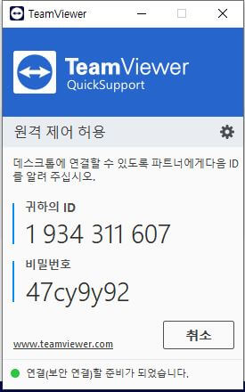 3. 함께 설치한 상대방 컴퓨터의 아이디와 비밀번호가 생성되어 있음