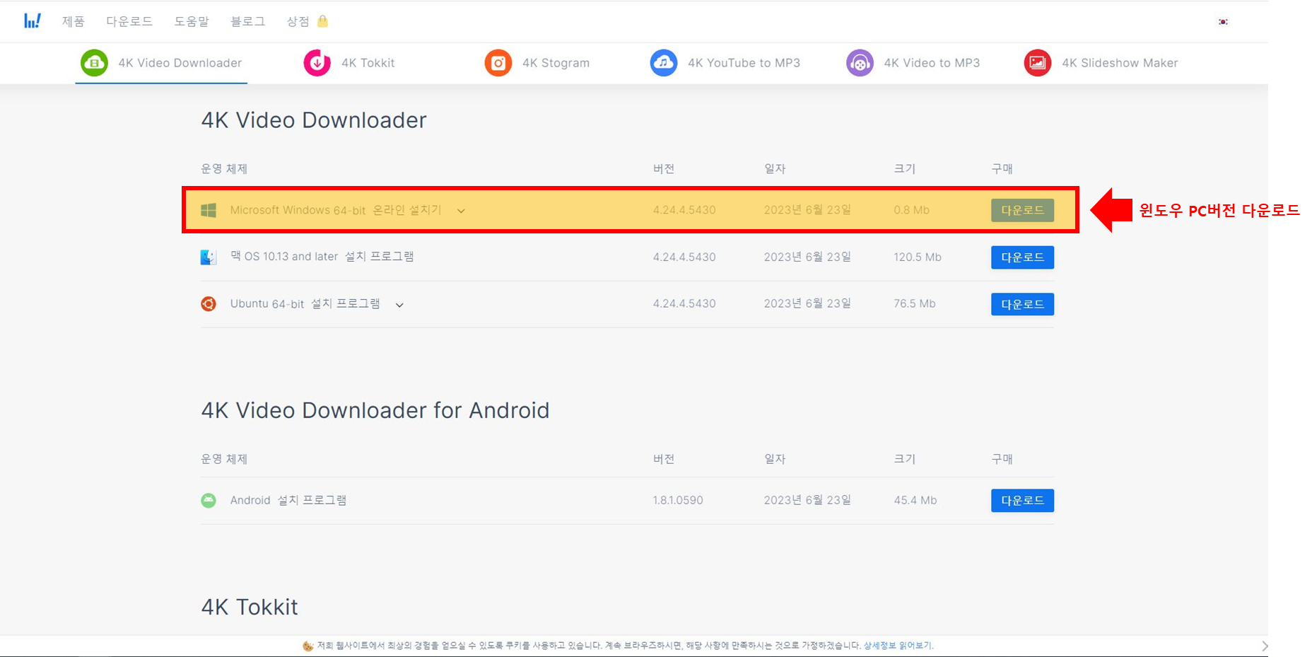 2. 4K Downloader 홈페이지 에서 PC버전 프로그램 다운로드